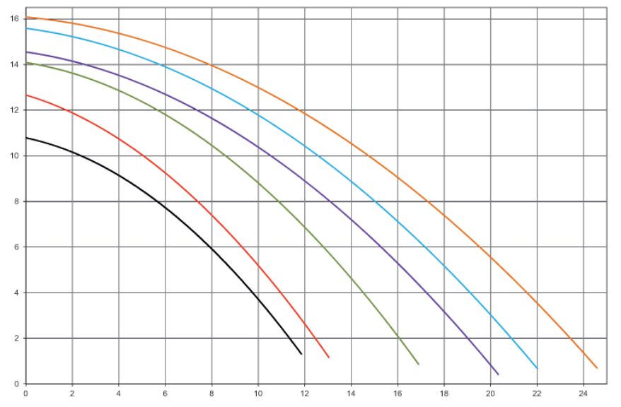 Fuerza | Caudal m3 /h | Longitud | Altura | E/S | Peso | P1 | P2 | Amperaje |